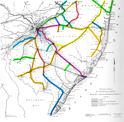 * The Camden Gloucester & Mt. Ephraim RR had established service to Gloucester in 1874 but Gloucester had already been reached by the West Jersey RR in 1857. (adding another color for this short distance would unnecessarily muddy the map as well). Many thanks to the West Jersey Chapter of the National Railway Historical Society for granting permission to use the base map, and to Paul W. Schopp for providing detailed information, advice and encouragement. Last updated: 2005 Seventh Month, 2nd. |