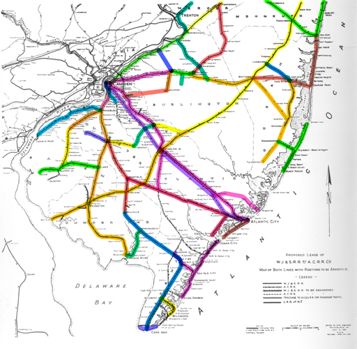 *The details behind the map pages covering 1890 through 1894 for the lines from Richland to Sea Isle City and Ocean City (through Tuckahoe and Petersburg) are complex and muddled. The Philadelphia and Seashore Railway COmpany established trackage between Winslow Junction and Sea Isle City as early as 1890, but poor construction and inter-company conflict apparently prevented regular passenger service from operating until 1894. First the West Jersey Railroad would not let the Philadelphia and Seashore connect its tracks in Richland. Then, in 1892, after the P. & S.S. entered bankruptcy, the W.J. R.R. acquired the right-of-way and incorporated two subsidiaries to rebuild and operate the line: the Winslow and Richland Railroad and the Richland and Petersburg Railroad. Subsequently, the Atlantic City Railroad prevented the W.J. R.R. from crossing A.C. R.R. to gain access to Winslow Junction. As a result, the W.J. R.R. sold the track to the South Jersey Railroad. The corporate sparring observed here represents a larger conflict, through proxies, between the Philadelphia and Reading Railroad, which controlled the Atlantic City Railroad, and the Pennsylvania Railroad, owner of the West Jersey Railroad. This round of the greater struggle between the two Philadelphia-based railroads culminated in a classic "frog war" at Woodbine in 1894. Although regular passenger service between Richland and Tuckahoe began operating during the summer of 1892, the West Jersey Railroad only provided a coach or combine attached to freight cars to accommodate the meager ridership. When the South Jersey Railroad acquired the line from the West Jersey Railroad, the S.J. R.R. instituted through service between Winslow Junction and Sea Isle City in July 1893. Many thanks to the West Jersey Chapter of the National Railway Historical Society for granting permission to use the base map, and to Paul W. Schopp for providing detailed information, advice and encouragement. Last updated: 2005 Seventh Month, 21st. |