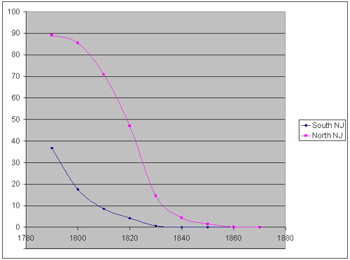 1) Percentages of African-American population enslaved in New Jersey, 1790 - 1870 (by north/south region)
