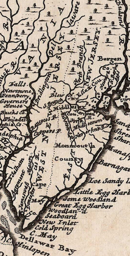 Of all of these, the 1687 "Keith Line" has been the most meaningful. Fuller explanation: The very first mention of a dividing line between Sir George Carteret's half-interest in New Jersey and John, Lord Berkeley's half-interest is in a confirming grant of July 29, 1674 to Carteret only. This specified a southern border for Carteret's land, which ran from the mouth of Barnegat Creek to (most probably) Pennsauken Creek (see the Barnegat - Pennsauken Line). The East Jersey/West Jersey line was then defined in a 1676 Quintipartite Deed between Carteret and Edward Billinge, (and the three Billinge Trustees: William Penn, Gawen Lawrie and Nicholas Lucas). The Deed described the line as running from... "... the northermost branch of the said bay or river of Delaware, which is in forty one degrees and forty minutes of lattitude, ...., called and agreed to be called the north partition point, and from thence, ... extending southward by a strait and direct line, drawn from the north partition southward, ... unto the most southwardly point of the east side of Little Egg Harbour...." ![]() Because the Keith line did not geographically agree with the wording in the 1676 deed, more accurate surveys had to be developed later, to resolve property disputes. This resulted in the Thornton line, c1696, and the Lawrence line, 1743, which is the one used for legal purposes today. An excellent source for learning more about the mapping of New Jersey is Snyder (1973). Here are some links to maps that show the various lines: A modern map showing the 1687 Keith line and the 1743 Lawrence line The 1688 Keith-Coxe-Barclay line which gave a lot more of the north-west part of the Jersies to West Jersey. This was agreed to by Daniel Coxe, who was (considered by some to be) the governor of West Jersey, and Robert Barclay[2] , the governor of East Jersey, but this line did not meet with wide acceptance among the inhabitants due to the shakiness of the claims to the government (see "Who's in Charge Here?"). The Coxe-Barclay extension basically gave present-day Morris and Sussex Counties to West Jersey, though there may have been some adjustments to those borders since 1688. The extension started where the Keith line had left off, - tracked east, downstream along the South Branch of the Raritan to the split with the North Branch, then - upstream along the North branch of the Raritan, then - up the Lamington (or Black) River, then - jumped by a straight line to the head of the Passaic (see the north border of Somerset County), - upstream along the Pompton to its split with the Pequannock, - upstream along the Pequannock, then from a point on the Pequannock at 41 degrees it jumped by a - straight line due east to the border with New York at the Hudson River Station Point at 41 degrees. Note that many sources continue the line to the head of the Pequannock, and thence Northeast (roughly along the current eastern border of Sussex County), up to New York Boundary Line (which was then also in dispute). This may have been a compromise used at some time, but the agreement between Governors Coxe (WJ) and Barclay (EJ) is explicit about the Station Point on the Hudson. It is important to remember that there was only a short period of time when both sides agreed with the Coxe-Barclay extension. East Jersey "disowned" it in 1695 and the colonial legislature rescinded it altogether in 1718. The c1696 Worlidge map showing the Thornton line. This map is located at the West Jersey History Project site which has other maps showing the various lines. A large version with great detail is also available at that site. (Note that the Worlidge line was probably surveyed c1696, but that this map dates from 1706 or later and may have landmarks that were not present in 1696.) Three (!) lines from Little Egg Harbor on State map of 1780s. This detail is rotated to the right and cropped to show the following three lines. - "Keith's Line of Division run in 1687 . . . Extended to the Delawar River" - "Quintipartite Line of Partition between East & West Jersey of 1676 run by Lawrence in 1743" - "Ideal Line to Mahacomack claimed by West Jersey Proprietors since the Year 1775" (A full "zoomable" map can be found here, at the Library of Congress map site, though you might have to download the MrSID plug-in to zoom). Larger regional maps sometimes drew a West/East line into their maps with rough approximation: A 1708 map by Moll (detail). Full map can be found here. A hopelessly inaccurate line, from a 1714 atlas by J. B. Homan (detail, showing a southern terminus in the Delaware Bay!). The full map is available at the Library of Congress website here. Notes: 1) George Keith is one of the more fascinating characters in the early cultural history of the Jersies. He had been a strong promoter of Quakerism in the British Isles and in Europe. Once in the New World Keith began to criticize Quakers in both the Jersies and in Pennsylvania for straying too far from Christian orthodoxy. Eventually, after forming a group called the "Christian Quakers" and causing a major schism in American Quakerism, he became an Anglican (in 1700) and worked to convert Quakers back to the Church of England. It is notable that, prior to his Anglican conversion, he wrote the second major protest to Quakers against the holding of slaves. (The first protest had been five years earlier (1688) by German Quakers in Pennsylvania). 2) Robert Barclay is famous among Quakers as the first formal Quaker theologian. His "Apology for the True Christian Divinity" is considered a classic. Most Quakers are not aware, however, of Barclay's role as the governor of East Jersey. Barclay never travelled to the New World. He had been an associate of George Keith, who was appointed East Jersey's Surveyor-General, under Governor Barclay. This site maintained by Bob Barnett. Last updated: 2015 Twelfth Month, 8th. |
